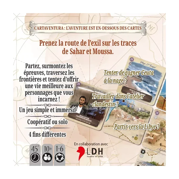 Cartaventura Exils est un jeu de société narratif jouable de 1 à 6 joueurs, dès 10 ans pour des parties d’environ 45 minutes, édité par Blam.