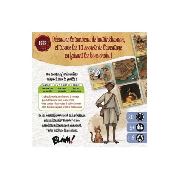 Dans Cartaventura Odyssée : Tu habites près de la Vallée des rois, là où sont enterrés les pharaons de l’Egypte antique. Un jour, l’opportunité de participer aux fouilles de la tombe de Toutânkhamon se présente, alors tu n’hésites pas ! Grâce à toi, une entrée est enfin découverte. Mais dans l’ombre, le chef des ouvriers semble manigancer contre l’expédition… Ainsi débute ton aventure !