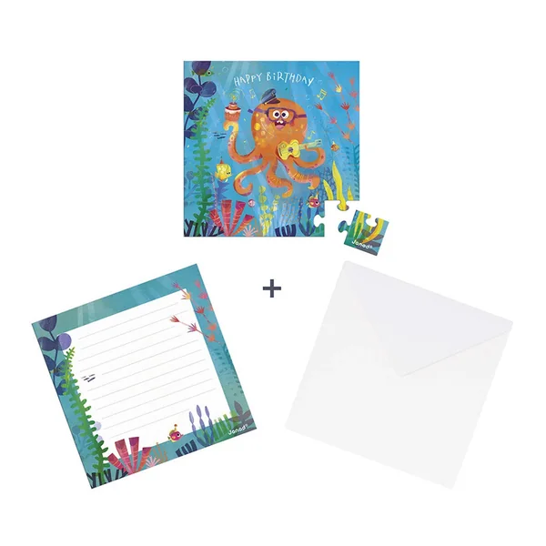 Avec cette carte puzzle en carton de 25 pièces, c’est l’effet waouh assuré ! Accompagné de sa guitare, ce poulpe est tout heureux de souhaiter un Joyeux anniversaire en musique. Très investi dans cette mission, il a même apporté le gâteau ! L’enfant assemble pièce par pièce ce puzzle et découvre une scène festive et amusante.
