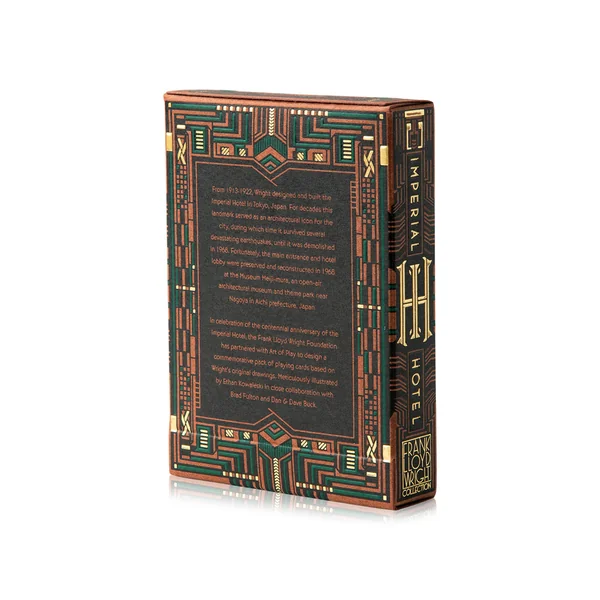 Pour célébrer le centenaire de l’Imperial Hotel, la Frank Lloyd Wright Foundation s’est associée à Art of Play pour créer un jeu de cartes commémoratif basé sur les dessins originaux de Wright. Illustré avec soin par Ethan Kowaleski, en étroite collaboration avec Brad Fulton et Dan & Dave Buck. Disponible exclusivement dans certains établissements FLW, nous avons le plaisir de proposer une quantité extrêmement limitée dans notre boutique.