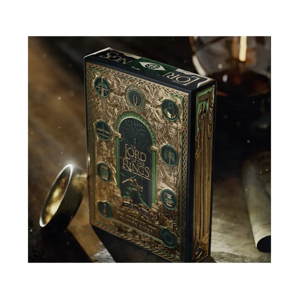 Ce coffret de luxe contient quatre jeux de cartes : deux éditions standard et deux éditions spéciales avec dorure pour les cartes à jouer du Seigneur des Anneaux, chaque carte arborant un dos scintillant en feuille d’or. Le coffret est équipé d’une fermeture magnétique et renferme une carte de la Terre du Milieu à l’intérieur !