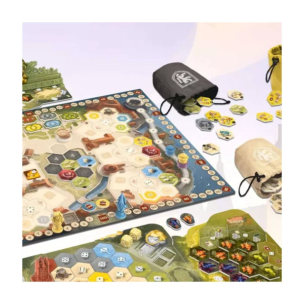 Contenu de la boîte : 1 Plateau Principal Recto Verso, 4 Sacs en Tissu, 42 Tuiles Marchandise en Bois, 24 Pièces d’Argent en Métal, 4 Plateaux de Joueurs à Deux Niveaux, 4 Grilles Transparentes de Plateau de Joueur, 60 Plateaux de Duché, 9 Dés, 17 Cartes Comté, 26 pions Ouvriers, 42 tuiles Marchandise acrylique, 12 tuiles bonus, 16 figurines de château, 4 figurines Point de Victoire, 4 marqueurs Ordre du Tour, 4 tuiles Point de Victoire (100/200), 4 Marqueurs Point de victoire, 18 Tuiles Bouclier, 1 plateau de duché pour la version solo, 4 plateaux de duché pour la version en équipe, 12 tuiles Routes Commerciales, 180+ Tuiles Hexagonales, 82 éléments pour l’extension Vignobles, Plus divers autres éléments