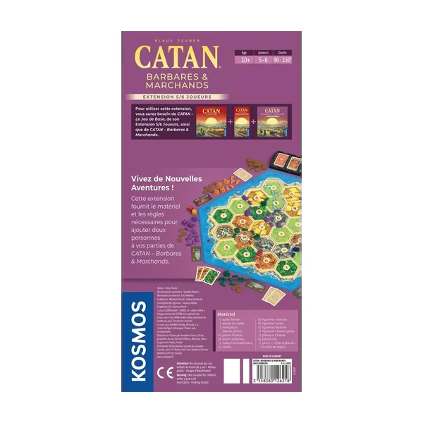 Dans l’extension Catan : Barbares et Marchands 5/6 joueurs : Exploitez des rivières aurifères, marchandez des poissons fraîchement pêchés et commercez avec les nomades du désert jusqu’à 6 joueurs.