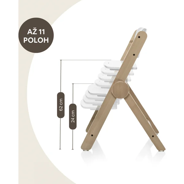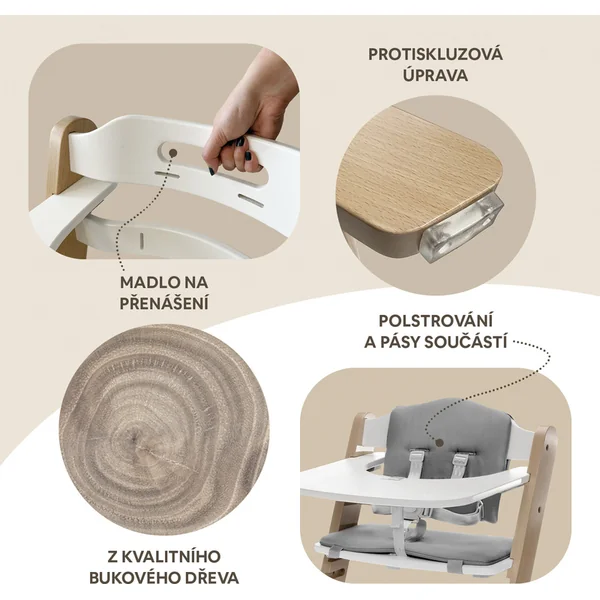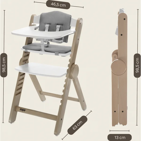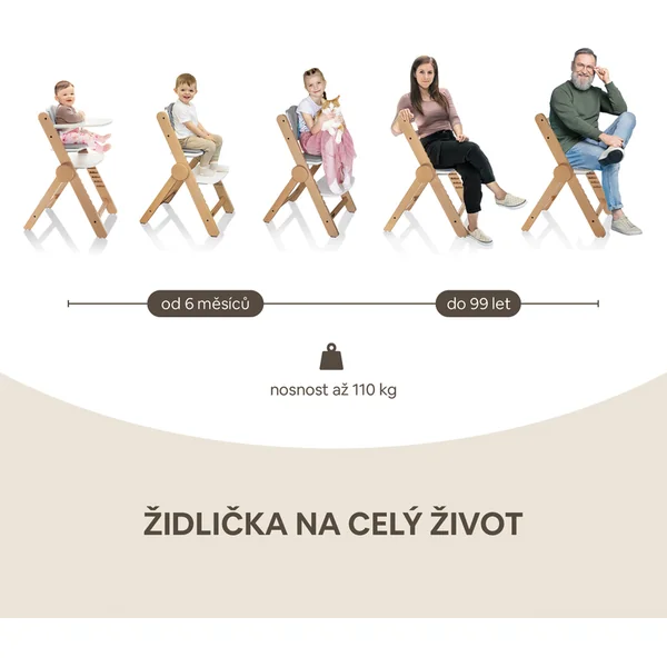 La chaise offre la possibilité de régler la hauteur du siège et du repose-pieds, s’adaptant ainsi parfaitement à un petit enfant qui goûte sa première purée, à un écolier en quête de connaissances en faisant ses devoirs, mais aussi à un grand-père qui l’aide. Cette chaise est fabriquée en bois de hêtre massif, offrant une résistance exceptionnelle et une capacité de charge testée jusqu’à 110 kg, ce qui lui permet de supporter également un adulte.