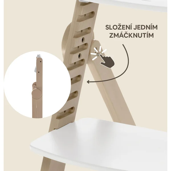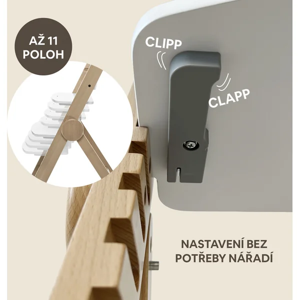 Grâce au système innovant Clipp & Clapp, il est possible d’ajuster facilement la chaise à la hauteur sans avoir besoin d’outils. Comme l’une des rares chaises en bois sur le marché, elle peut être pliée, ce qui, grâce à ses dimensions compactes une fois pliée, permet un rangement facile, et la poignée facilite le transport de la chaise.