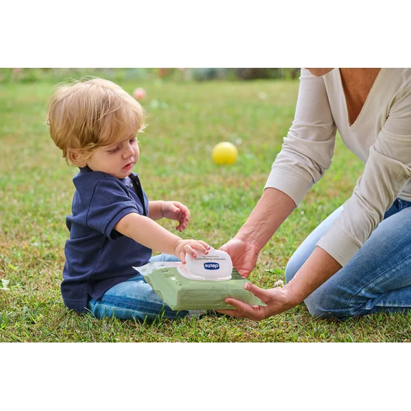 Les lingettes humides Chicco sont fabriquées à partir de 100 % de fibres naturelles biodégradables et sont idéales pour le changement de couches ainsi que pour le nettoyage des mains et du visage de votre bébé.
