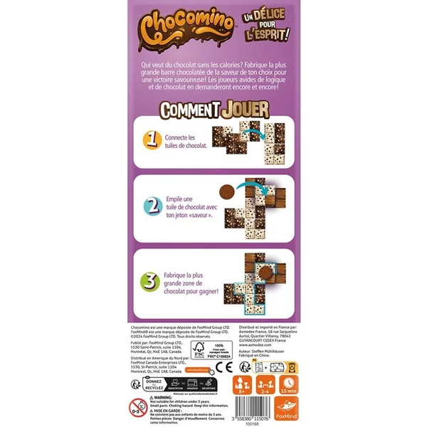 Chocomino est apparenté au jeu Scho K.O. sorti précédemment, mais comprend une troisième couleur de chocolat, les smarties rouges étant divisés équitablement entre tous les joueurs. Information : Attention, présence de petits éléments, risque d’étouffement. Ne convient pas aux enfants de moins de 36 mois. FAQ