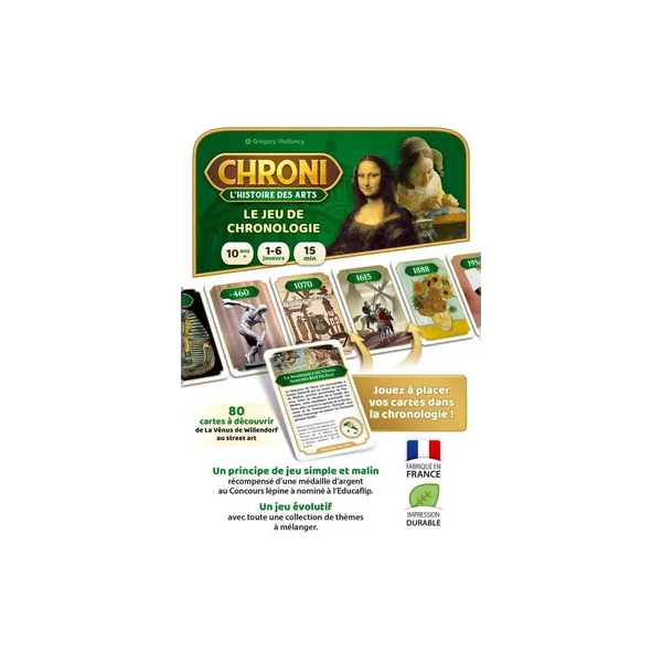 Chroni L’histoire des Arts est un jeu de cartes éducatif de la gamme Chroni Le jeu de Chronologie, dès 10 ans, de 1 à 6 joueurs, pour des parties de 15 minutes.
