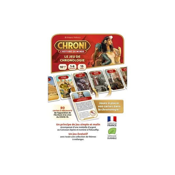 Chroni L’histoire du Monde, est un jeu de cartes éducatif de la gamme Chroni Le jeu de Chronologie, dès 10 ans, de 1 à 6 joueurs, pour des parties de 15 minutes, édité par On the go Editions.