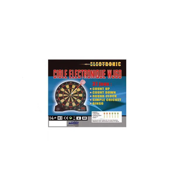Contenu : 1 cible électronique, 6 fléchettes à pointe nylon, 6 pointes nylon de recharge.