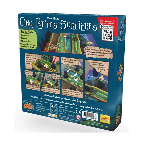 Cinq Petites Sorcières est un jeu de société pour enfant jouable de 2 à 6 joueurs, dès 3 ans pour des parties d’environ 15 minutes, édité par Oya.