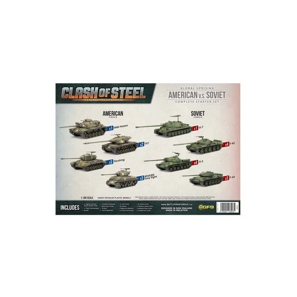Ce kit de démarrage Clash of Steel contient tout ce dont un joueur a besoin pour commencer, y compris des figurines pour les nations américaine et soviétique, des règles, des dés, des jetons et bien plus encore.