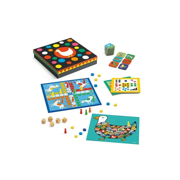 Un coffret complet de 12 jeux de société classiques pour les enfants à partir de 4 ans : un jeu de petits chevaux, un jeu de l’oie et un jeu d’échelles et serpents simplifiés, un jeu du morpion, un Mémo, un Loto, un Yam’s des petits, des jeux de dés…