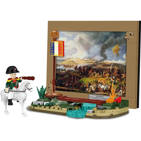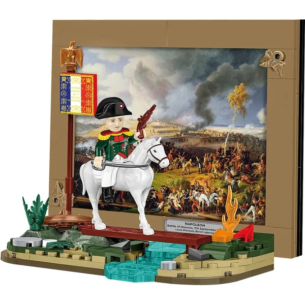 Le set se compose de 62 pièces, permettant de construire un fragment de la scène de la bataille de Moscou. En plus de deux figurines finement imprimées, le set comprend également un morceau de mur détruit, un arbre et divers accessoires d’époque, tels qu’une carte de la Russie, un télescope et des sabres. La figure de Napoléon est représentée dans son célèbre manteau gris et son chapeau bicorne. Le modèle est conçu pour paraître réaliste, et grâce à sa haute qualité de fabrication, il est adapté non seulement pour jouer, mais aussi pour des fins d’exposition.