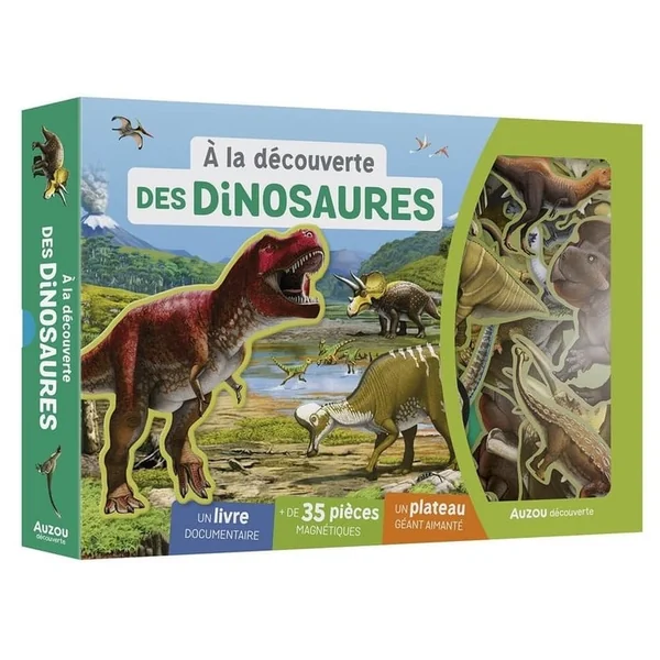 La boîte comprend un livre documentaire de 64 pages pour tout savoir sur les dinosaures, ainsi que + de 35 aimants à replacer sur un grand plateau aimanté.