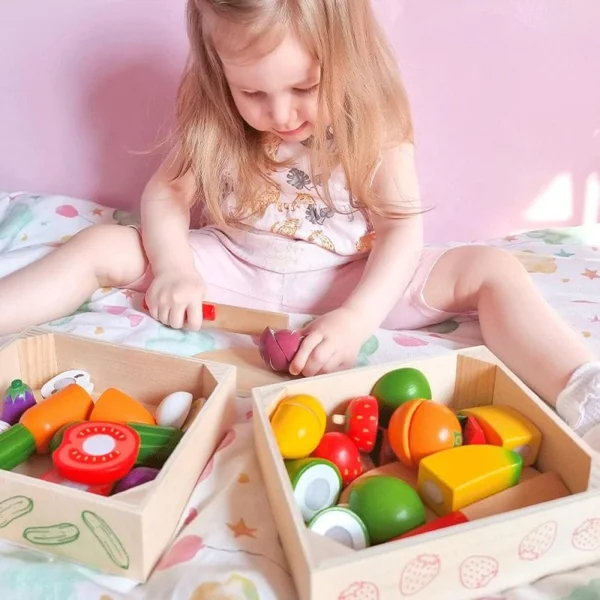 Les aliments en bois sont parfaits pour aider les enfants à comprendre l’importance d’une alimentation saine et équilibrée, la provenance de nos aliments et la façon dont nous les préparons. Une fois le temps de jeu terminé, les aliments en bois peuvent être rangés dans la caisse de rangement .