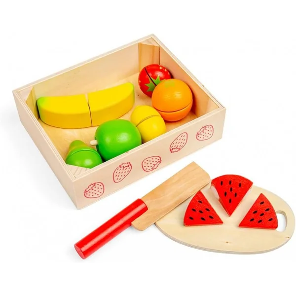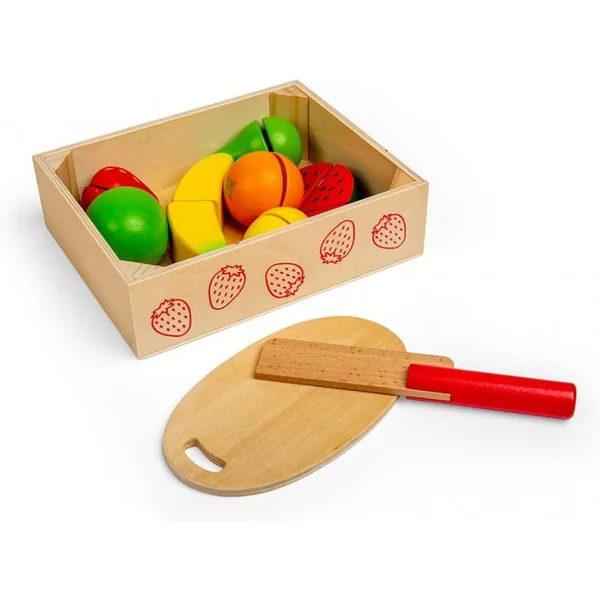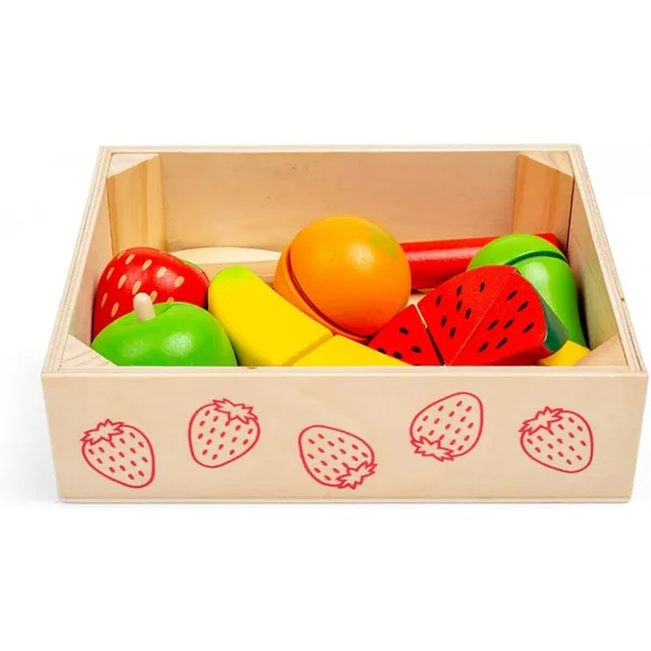 Les petits chefs peuvent s’entraîner à découper des fruits avec cette caisse à découper colorée en bois . Un excellent moyen d’apprendre la sécurité en cuisine, notre ensemble de jeu pour enfants comprend une pomme, une poire, une orange, un citron, une fraise, une banane et un melon. Tous les fruits sont dotés de fermetures velcro, afin que les enfants puissent les découper en toute sécurité avec le couteau en bois sur la planche à découper incluse.