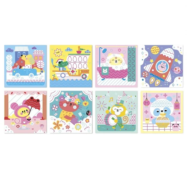 Initie toi au graphisme décoratif grâce à des animaux mignons et rigolos ! À l’aide des feutres effaçables (un bleu et un rose) et des formes pré-tracées sur les tableaux, l’enfant peut s’entrainer à tracer des boucles, des ondulations, des éléments symétriques. Il faut compter environ 1h30 pour compléter les 4 tableaux mais ils peuvent être réalisés à l’infini car effaçables. Cela permet de s’entraîner et progresser rapidement !
