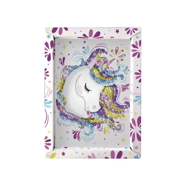 Tu trouveras dans ce kit l’illustration d’une licorne dans son cadre, avec une plaque de polystyrène qui sert de base pour fixer les sequins à l’aide de petites épingles.Un compartiment à sequins t’aidera à ranger tous tes sequins sans les mélanger !
