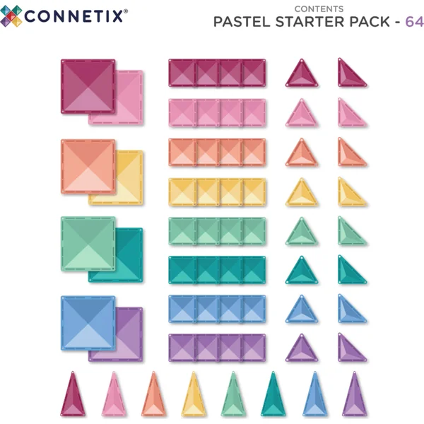 Découvrez votre ingénieur, artiste et designer intérieur en construisant et en créant avec les pièces CONNETIX ! Le pack de démarrage Pastel de 64 pièces CONNETIX, qui comprend divers petits et grands carrés, ainsi que des triangles équilatéraux, isocèles et rectangles dans nos couleurs pastel uniques de la Terre, offre un potentiel de jeu illimité.