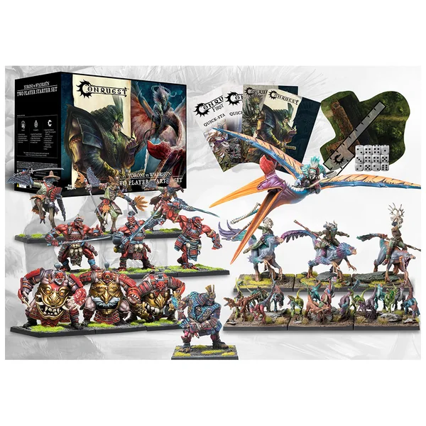 Avec des scénarios proposés conçus pour vous faciliter l’accès au système de Conquest, la boîte « Conquest – Yoroni vs W’adrhun – Starter 2 joueurs » contient un warband de départ et une unité de commandement pour chaque faction. Les Yoroni (la 9ème faction) affronte les bêtes des W’adrhŭn. Ces figurines W’adrhŭn vous ramèneront très loin dans le temps, grâce à leur sculpture très détaillée qui inclut des plumes précises sur les nombreux dinos. L’armée W’adrhŭn comprend le majestueux monstre volant, le Quatl, qui dirige la meute de chasseurs et les cavaliers rapaces. Les Yoroni sont des brutes – toutes des brutes, grandes et puissantes. Les Yoroni sont une force très flexible pour un débutant, car ils peuvent activer n’importe quelle unité avec n’importe quelle carte, ce qui évite les erreurs au début. Cependant, au fur et à mesure que leur expertise avec la pile de commandement augmente, les joueurs Yoroni peuvent commencer à échanger cette flexibilité contre de la puissance en associant l’Idéal à celui de l’unité qu’ils souhaitent activer, tirant ainsi davantage de puissance de leurs unités d’élite déjà en place.Ce set comprend le personnage Daimyo qui dirige ces Brute Stands ; Oni Ayakashi, Tengo Bushi et Kami Akumi.