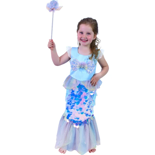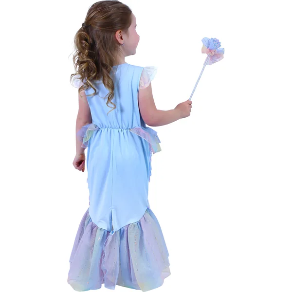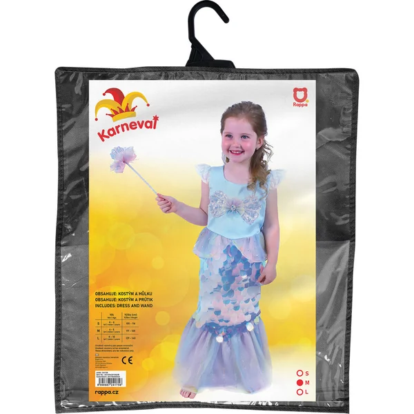 L’emballage contient une robe exclusive, ornée de paillettes qui ressemblent à des écailles, le costume comprend une baguette.