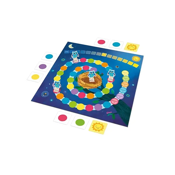 Allez hop, au lit les petits hiboux ! Il est temps de rentrer se coucher. Aidez les hiboux à rentrer au nid avant que le soleil ne se lève. Jouez une carte couleur et volez jusqu’à la prochaine case de cette couleur sur le plateau. Quand vous piochez une carte Soleil, vous vous rapprochez de l’aube. Les joueurs vont faire équipe pour que tous les hiboux soient rentrés à la maison avant le lever du soleil.