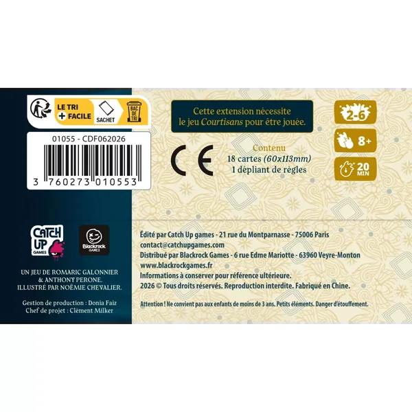 Courtisans : Diplomates et Confidents est une extension jouable de 2 à 6 joueurs dès 8 ans pour des parties d’environ 25 minutes, édité par Catch up Games.