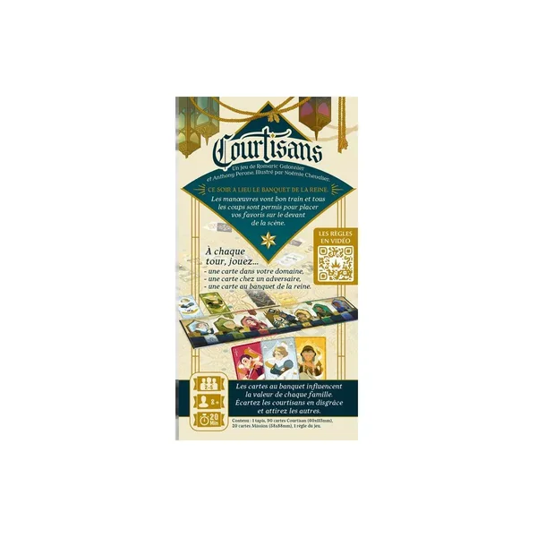 Courtisans est un jeu de cartes médiéval, dès 8 ans, de 2 à 5 joueurs, pour des parties de 20 minutes environ, édité par Catch Up Games.