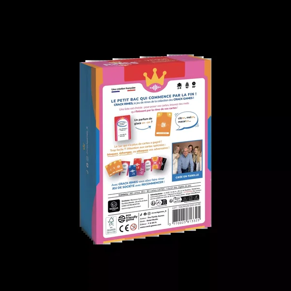 Crack Rimes est un jeu qui reconnecte et réunit toutes les générations. Des parties rapides, qu’on a envie de relancer. Du challenge, du quiz culture générale, des coups bas, un peu de stratégie et surtout des fous rires garantis !