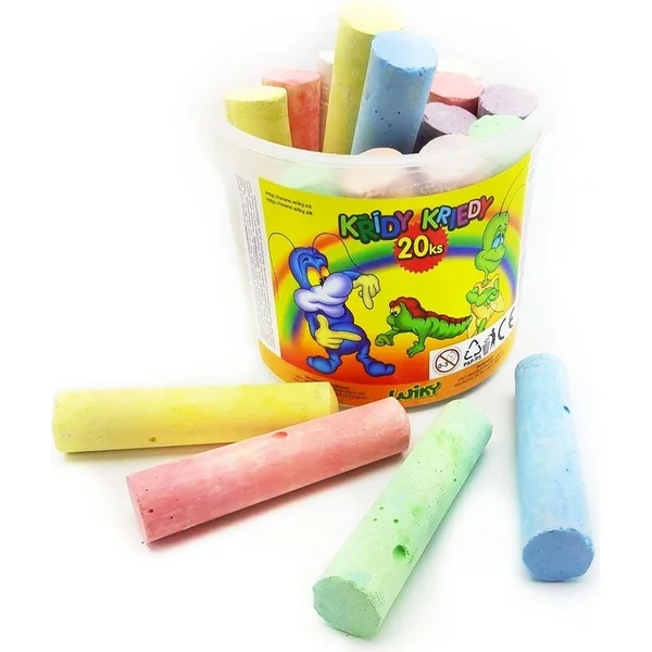 Craies colorées dans un seau en plastique. Les craies ont une forme ronde.