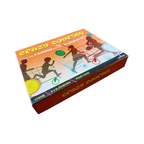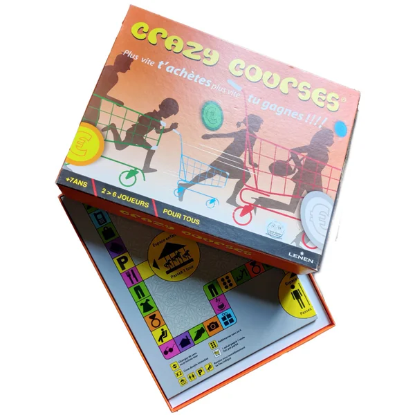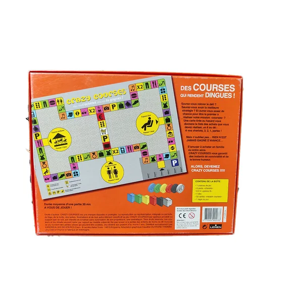 Créé en France. Fabriqué en UE. La boîte Crazy Courses contient un plateau de jeu imprimé, 6 jetons caddies, 6 x 4 jetons pièces, de nombreuses cartes « mission courses », 1 dé.