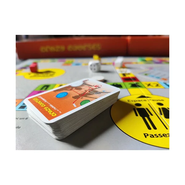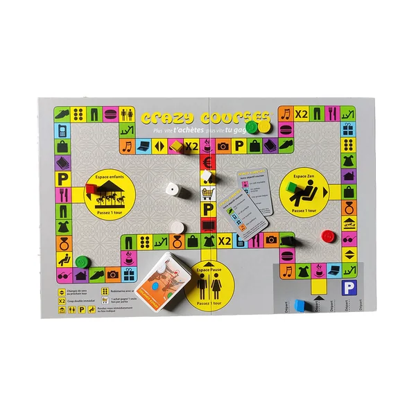 Chaque joueur dispose d’un jeton caddie + 4 pièces assorties. Tire une carte « mission courses » au hasard qui est ton objectif secret à réaliser pour gagner la partie. Un 6 au dé pour sortir du parking et en avant pour l’aventure. Mais attention aux autres joueurs et au parcours avec ses cases jaunes, car avec Crazy Courses rien n’est gagné d’avance !