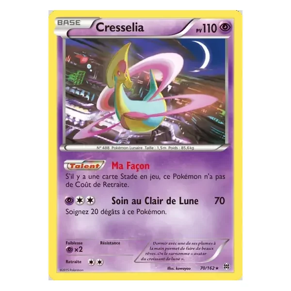 Découvrez Cresselia (bkt070), une carte Pokémon de l’extension Impulsion Turbo, provenant du bloc XY. Idéale pour compléter votre collection, cette carte Rare plaira autant aux collectionneurs qu’aux joueurs.