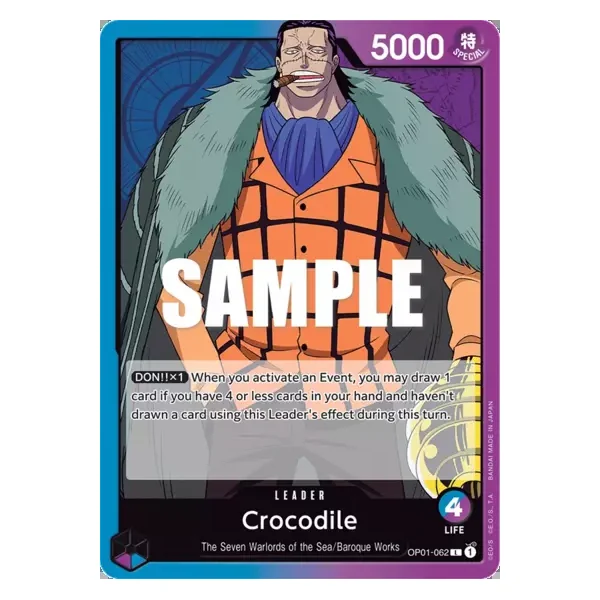 Découvrez Crocodile (op01062), une carte Leader de l’extension Romance Dawn. Idéale pour compléter votre collection, cette carte Leader plaira autant aux collectionneurs qu’aux joueurs.