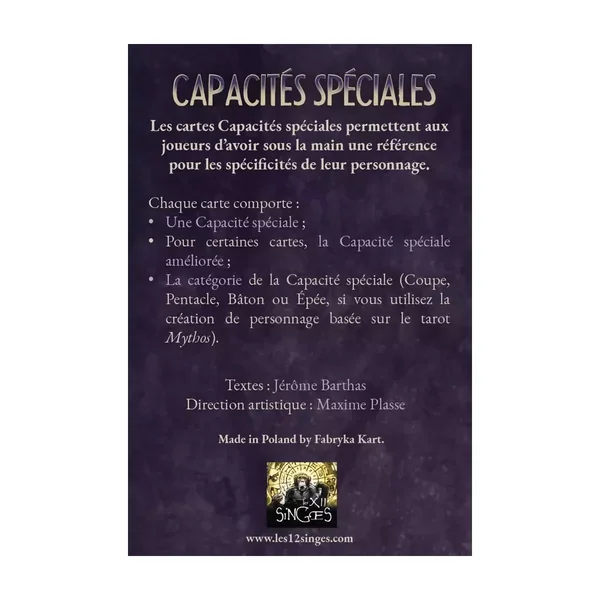 Ce paquet de 55 cartes contient toutes les Capacités spéciales de la réédition de Cthulhu Hack. Un outil bien pratique pour les joueurs, qui peuvent ainsi consulter les spécificités de leur personnage, ou choisir une amélioration facilement en fin de scénario.