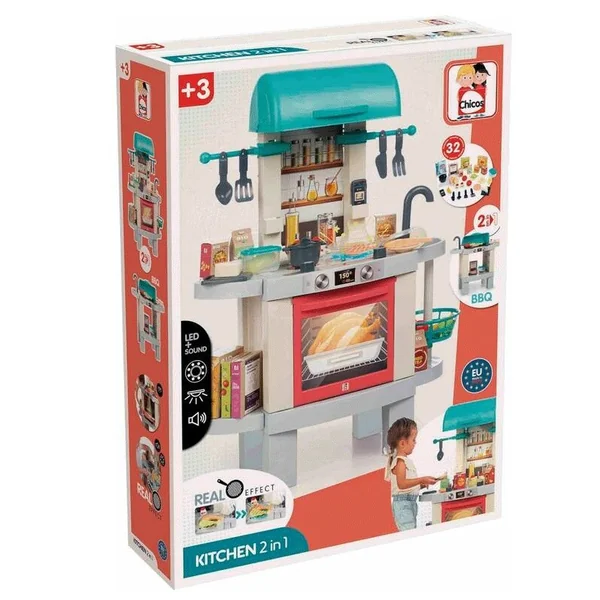 Cuisine 2 en 1 Chicos – Jouez aux fourneaux avec cette fantastique cuisine ultra-réaliste, équipée de tout le nécessaire pour votre petit chef. Les aliments changent de couleur grâce à la technologie photochromique. La cuisinière est équipée de 8 LED pour un résultat encore plus réaliste.