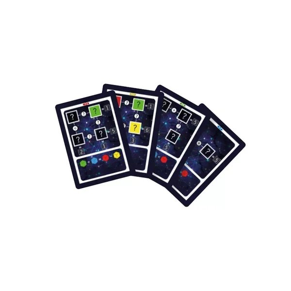 Les cartes-défis sont divisées en deux sections : les calculs dans la section supérieure et les indices logiques dans la section inférieure. Des points d’interrogation se trouvent sur chaque carte-défi.