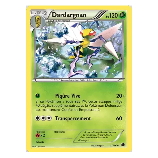Découvrez Dardargnan (plf003), une carte Pokémon de l’extension Glaciation Plasma, provenant du bloc Noir & Blanc. Idéale pour compléter votre collection, cette carte Rare plaira autant aux collectionneurs qu’aux joueurs.