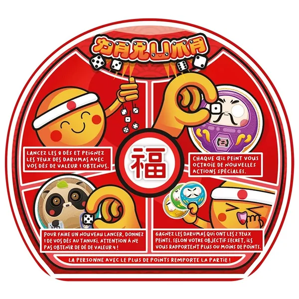 Votre but est d’avoir le plus de points à la fin de la partie grâce à vos darumas. Ces derniers rapportent plus ou moins de points selon votre objectif secret. Pour obtenir ces darumas, vous devez « peindre » leurs yeux en y plaçant uniquement des dés de valeur 1 obtenus durant votre tour de jeu.