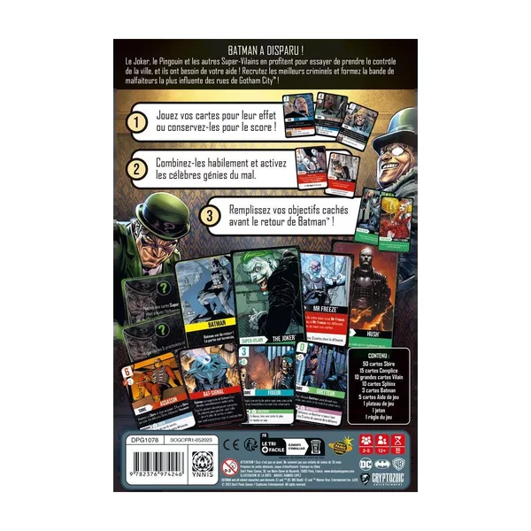 Au cours du jeu, vous aurez la possibilité de déployer certains criminels en posant des cartes devant vous afin d’en activer les pouvoirs. Les criminels de votre main rapporteront autant de points en fin de partie que la valeur qui est inscrite sur la carte. Les Super-Vilains, si vous suivez leurs directives, vous permettront de marquer des points supplémentaires. Bien que puissants par leurs effets, les criminels déployés devant vous ne vous rapporteront aucun point en fin de partie. Vous aurez besoin d’équilibrer votre jeu entre pouvoirs déployés et cartes que vous devrez garder en main pour marquer des points en fin de partie. Dès que Batman réapparaît, le joueur qui totalise le plus de points est déclaré vainqueur.