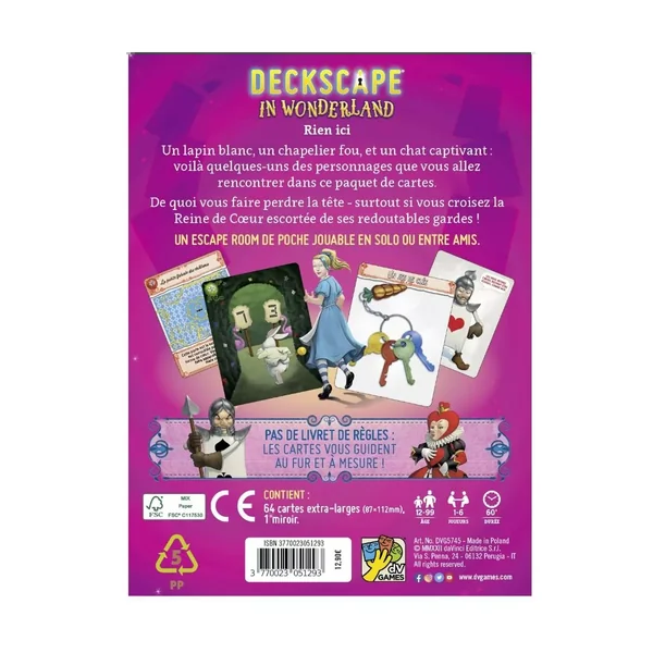 Deckscape In Wonderland contient : 64 cartes 87 x 112 mm et 1 miroir.