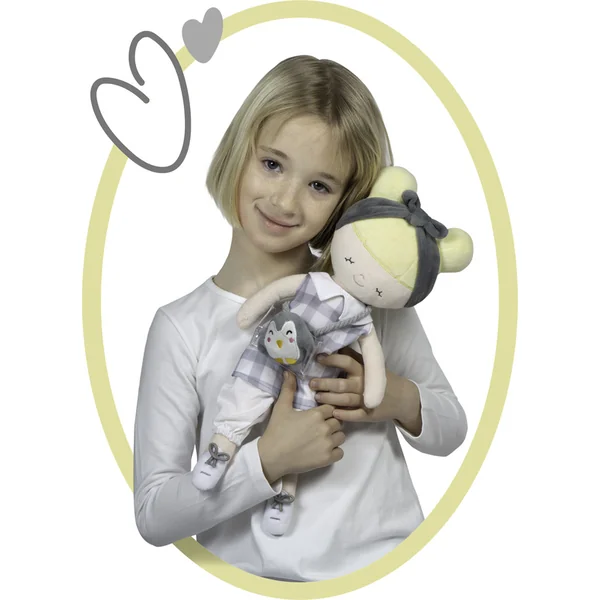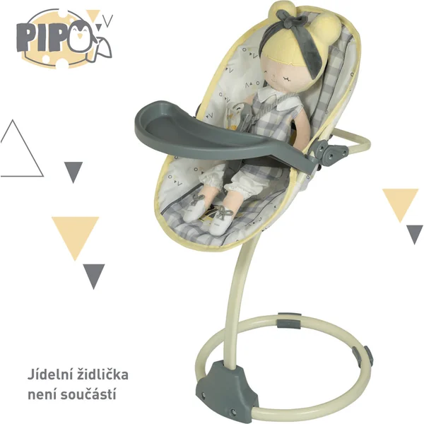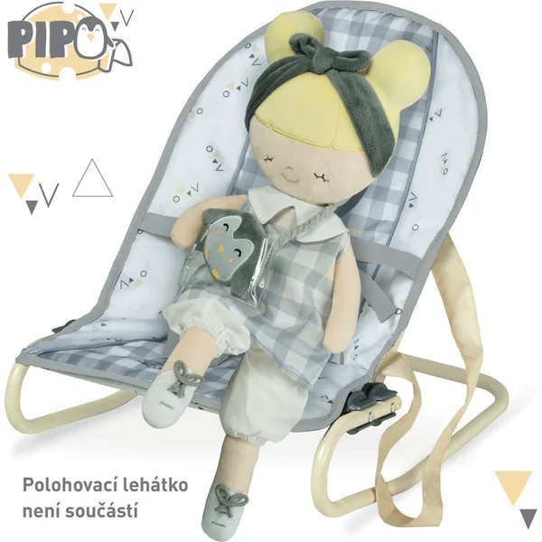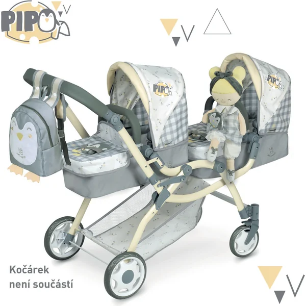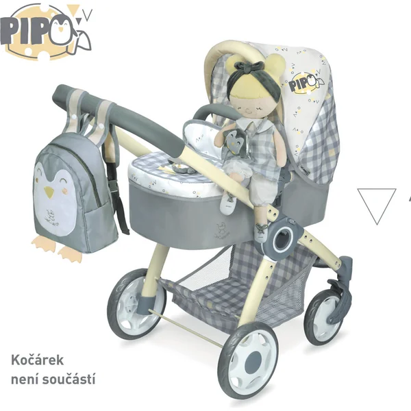 La poupée en peluche PIPO est une petite demoiselle avec un pingouin en peluche, faisant partie de la collection éponyme, qui est une nouveauté de l’année 2022 et propose, en plus de différents types de poussettes et de meubles pour poupées, d’autres accessoires pour les futures ménagères. Elle se caractérise par un motif à carreaux gris et blanc combiné avec des parties unies en gris et blanc et des accessoires à motif finement jaune, ainsi que le pingouin PIPO déjà mentionné.