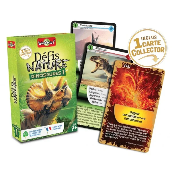 Le principe du nouveau Défis Nature – Dinosaures 1 est simple : les enfants de 7 ans et + parient sur les points forts des dinosaures. Le joueur qui possède la plus forte caractéristique remporte les cartes des autres joueurs. Le premier à collecter toutes les cartes du jeu gagne la partie.
