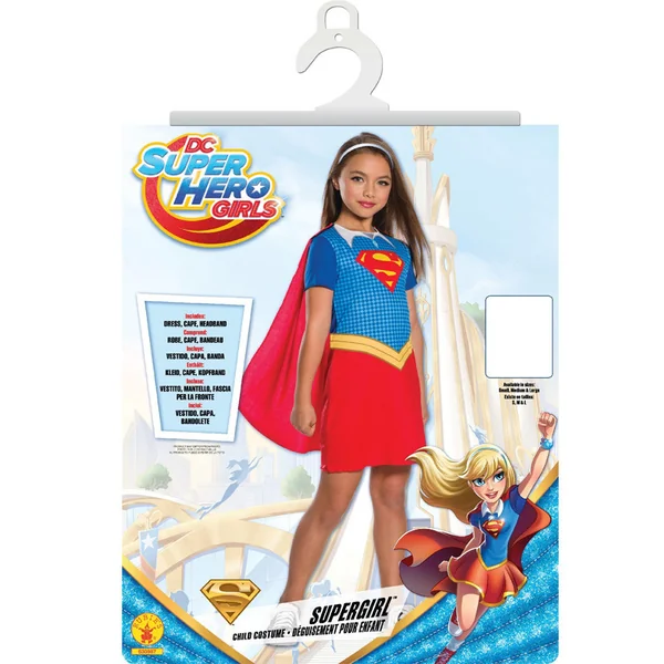 Une robe en jersey imprimée avec cape détachable rouge. Un serre-tête de Super-Girl.