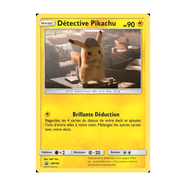 Découvrez Detective Pikachu (sm194), une carte Pokémon de l’extension Promos Soleil & Lune, provenant du bloc Soleil & Lune. Idéale pour compléter votre collection, cette carte Promo plaira autant aux collectionneurs qu’aux joueurs.