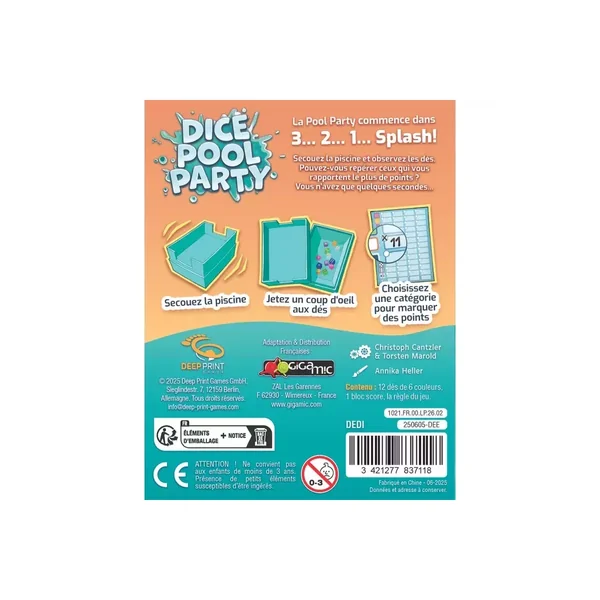 Dice Pool Party est un jeu de société d’ambiance jouable de 2 à 6 joueurs, dès 8 ans pour des parties d’environ 15 minutes, édité par Gigamic.