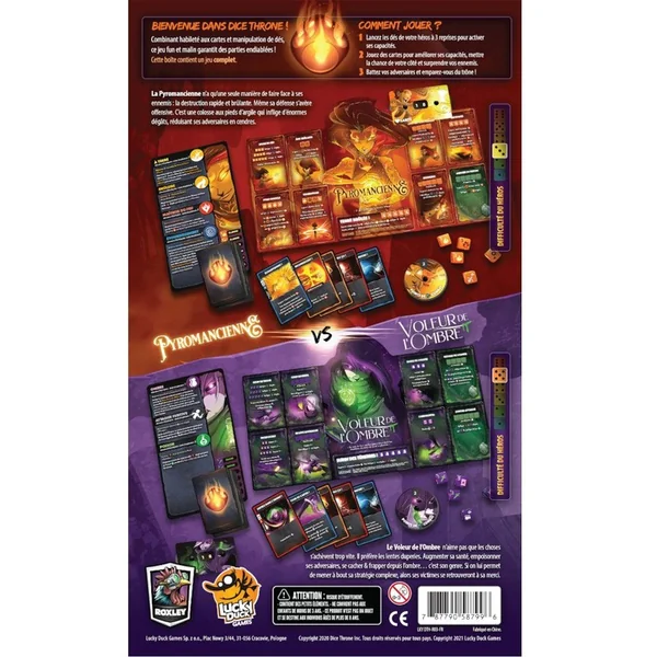 Jouez avec le feu (littéralement) contre les ombres. Ces 2 personnages proposent à un joueur débutant d’incarner la pyromancienne et son adversaire, plus aguerri, de faire danser les ombres dans un combat sans merci ! Ces 2 héros de l’univers de Dice Throne sont très puissants et restent équilibrés avec tous les autres personnages de la gamme !