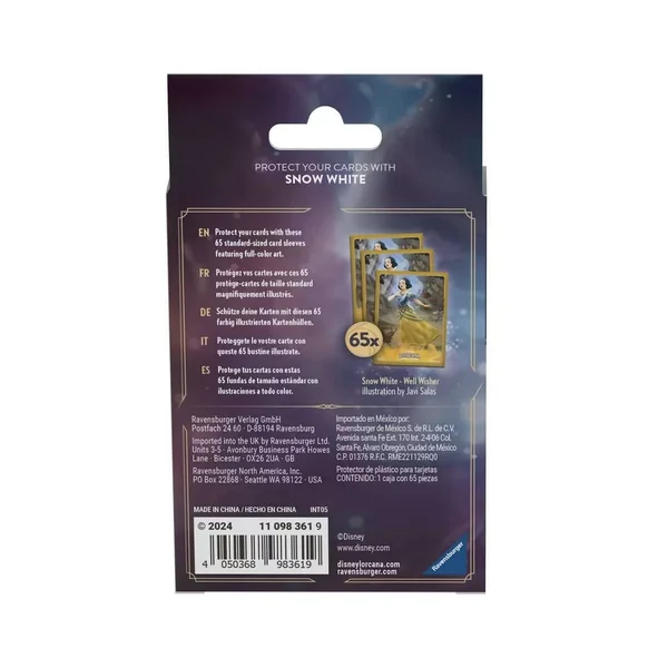 Disney Lorcana : Sleeves – Quatrième Chapitre : Chaque paquet contient 65 protège-cartes à finition mate représentant un reflet Disney Lorcana. Les personnages présentés seront Génie et Blanche-Neige.