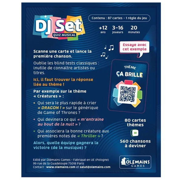 Test ta culture musicale autrement avec DJ SET ! Dans ce quiz musical unique, oublie le titre et l’artiste : chaque chanson cache un thème à deviner. Avec plus de 500 musiques réparties en 80 thèmes, ce jeu de société musical promet des heures de défis, fun et ambiance entre amis. Parfait pour les amateurs de quiz, culture musicale et soirées ludiques, il transforme chaque partie en une expérience interactive et festive.